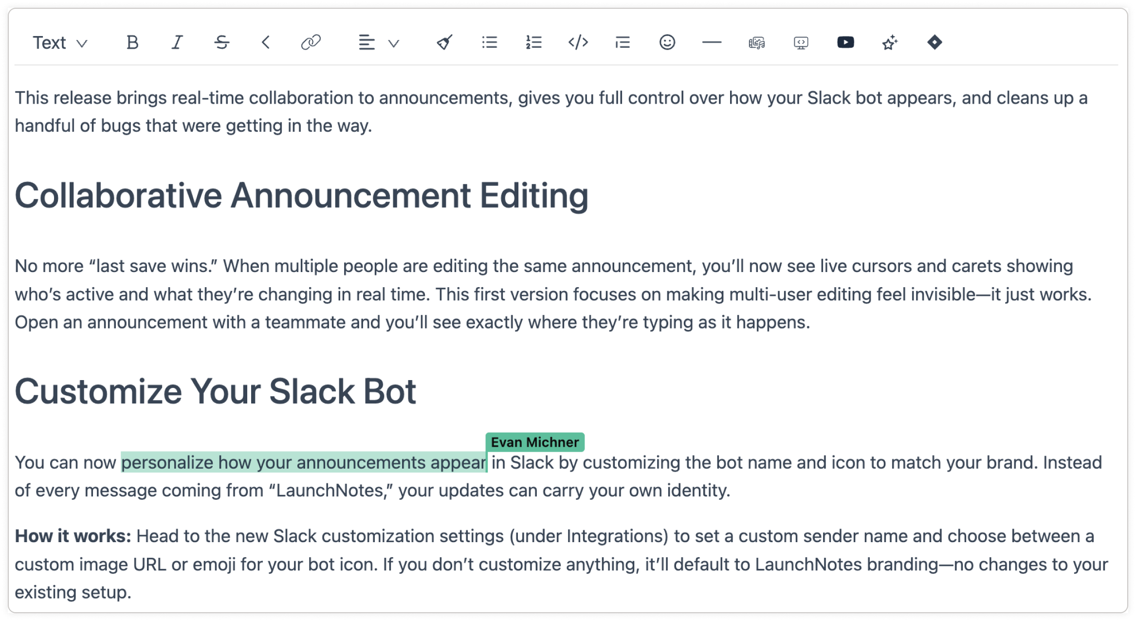 Like feature releases, communicating product updates is a team sport. Now the LaunchNotes editor is too!