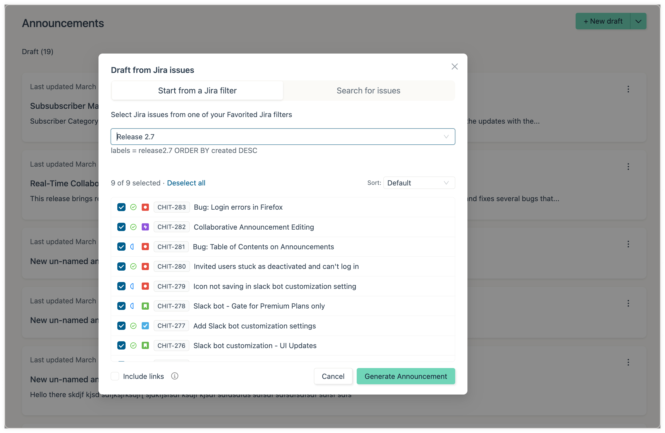 Interested in getting set up with a direct Jira connection to make drafting announcements easier? Let us know, and we'll get you set up. Feedback button, left side. We read everything!